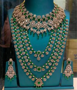 Two-tone plated AD Necklace Set having emerald and AAA American diamonds studded and tiny pearl hangings with Earrings and necklace adjustable chain. Bridal Necklace Set, Emerald Diamond Necklace, Zirconia Necklace Set. Gorgeous gold plated This Necklace set comes in a beautiful box, making it an ideal gift for birthdays, weddings, or anniversaries. Pair it up with your silks and satins and shine like a glowing star at the next event!